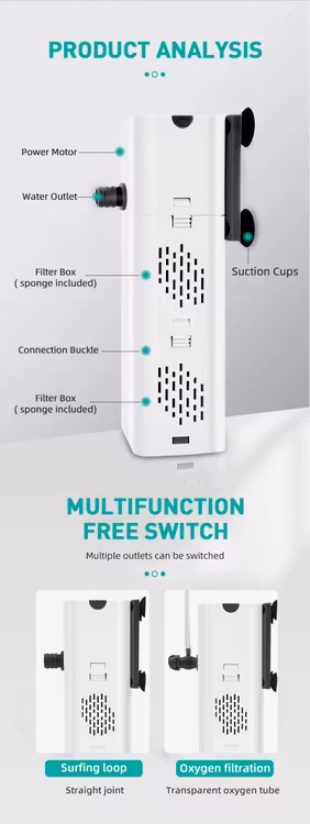 Innerfilter 9100F är designad för att effektivt filtrera och syresätta akvarievattnet. Detta innerfilter levereras med ett modulärt filtersystem (2 st. filterbehållare), så du enkelt kan anpassa höjden på ditt filter så det passar ditt akvarium och dina behov. Man kan enkelt justera pumpens utblåsriktning genom att vrida på reglaget på utblåspipan. Levereras med reglerbar diffusor för lufttillförsel i akvariet samt 3 kopplingar för utblås. De två filterkassetterna innehåller en grov filterkub. Enkelt avtagbar filterbehållare underlättar rengöring av filter och impeller.