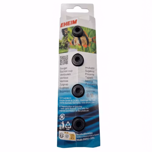 Originalreservdel från EHEIM: fyra hållbara sugkoppar som säkerställer stabil montering av ditt filter eller pump mot akvarieglast. En enkel men viktig komponent för att undvika att utrustningen glider eller lossnar.