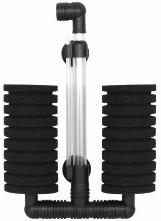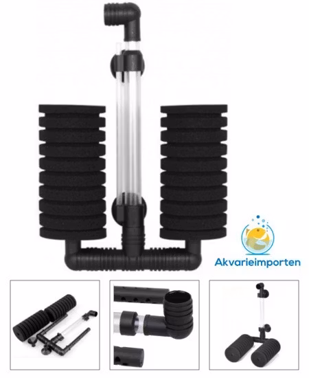 Svampfiltret kopplas till en luftpump som skapar ett vattenflöde genom svampen samtidigt som man syresätter vattnet. Utblåset kan dras ut till önskad höjd (min. 23cm - max 34cm).