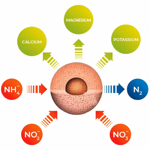 - Aktiv adsorption: Sinterad glasstruktur med inre håligheter adsorberar effektivt skadliga NH₄⁺- och NO₂⁻-joner från vattnet.