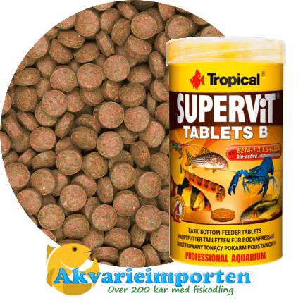 Multi-ingrediensfoder i form av självhäftande tabletter för daglig utfodring av små allätande fiskar, bottenfiskar, växande yngel, sniglar och vattensköldpaddor. Immunstimulant – betaglukan och stabiliserad C-vitamin som ingår i fodret stärker immunförsvaret, och bidrar i kampen mot patogener. Dussintals av noga utvalda råvaror av högsta kvalitet, kompletterade med optimalt utvalda vitaminer och spårämnen, säkerställer energi- och näringsbehovet hos de mest krävande fiskarterna. SUPERVIT TABLETS B varierande och fullgoda sammansättning gör det lämpligt i sällskapsakvarier.