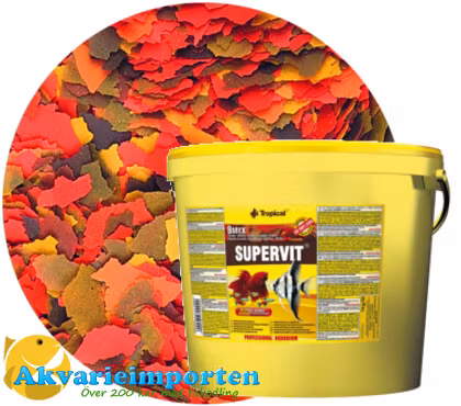 SUPERVIT är ett välbalanserat multi-ingrediens flingfoder som innehåller åtta olika typer av flingor med dussintals av noga utvalda råvaror av högsta kvalitet. Det har en hög nivå av värdefulla proteiner, vitaminer, mineraler, spårämnen, samt olika färgförstärkande pigment som gör att fiskarnas färger snabbt ökar i intensitet. SUPERVIT innehåller även beta-1,3/1,6-glukan. Beta-1,3/ 1,6-glukan är mycket viktigt för tropiska fiskar eftersom det har en kraftfull effekt på hälsa, sjukdomsresistens och immunförsvarets förmåga att bekämpa infektioner och döda angripande bakterier och parasiter.