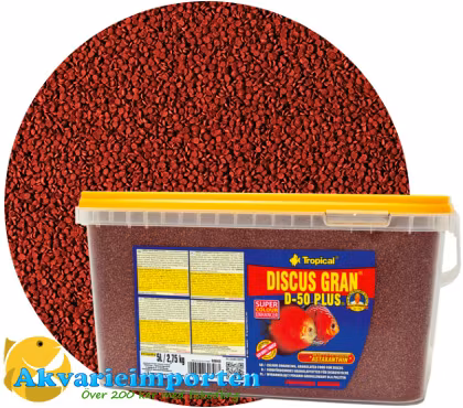 Tropical Discus Gran D-50 Plus är ett högklassigt färgförstärkande kvalitétsfoder i form av sjunkande granulat med en hög proteinhalt (50%) för unga och vuxna diskus och andra särskilt krävande fiskar. Fodret säkerställer en sund tillväxt och utveckling av unga fiskar, och stimulerar lek. Det höga innehållet av astaxantin förstärker färgerna och har positiv effekt på fiskars kondition. Beta-glukan som finns i granulatet stärker fiskarnas immunförsvar.