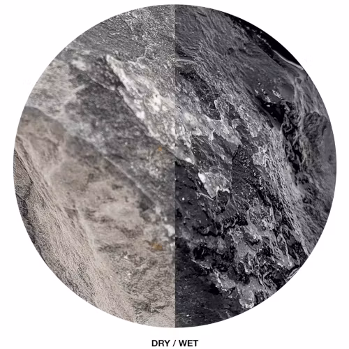 Black Venom Rock kännetecknas av sin djupa svartgrå färg med intensiva skiftningar och kraftfulla svarta inslag. Den har en naturligt grov och skrovlig yta med tydliga fåror och detaljer som fångar både ljus och skugga – vilket skapar ett livfullt spel och visuellt djup.