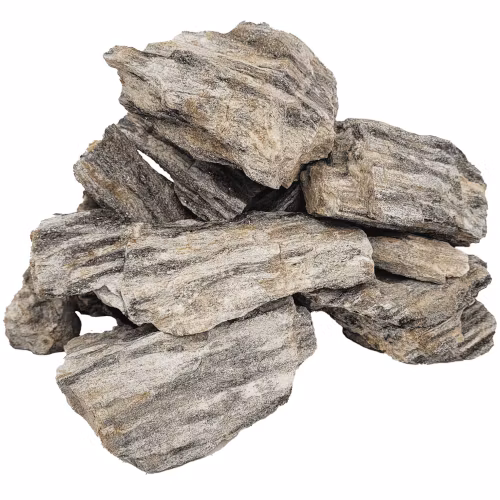 Grey Fossil Wood Nano Rock kännetecknas av sin distinkta textur som påminner om ådringen i förstenat trä, med subtila skiktningar och en sober färgpalett i grått, ljusbrunt och ibland svagt blåtonade inslag. Stenens linjer och mönster skapar naturlig riktning och flöde i layouten – perfekt för att leda blicken genom scapen eller rama in växtgrupper med en organisk känsla.