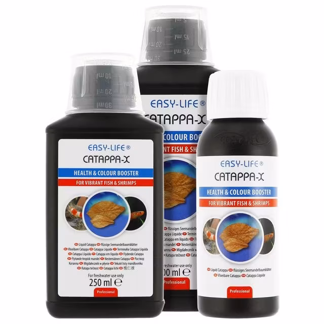 Genom att använda Easy Life Catappa-X undviks dessa nackdelar. Vattnet förblir klart samtidigt som de positiva effekterna på djurens hälsa och välbefinnande bibehålls. Den flytande formen av Catappa-X är enkel att dosera och använda i akvarievattnet.