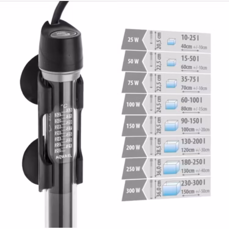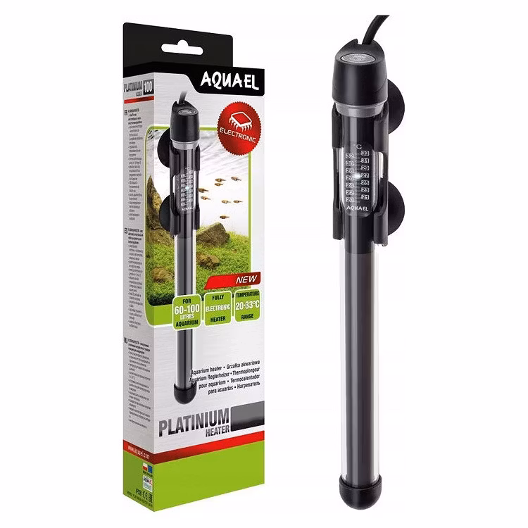 Aquael Platinium akvarievärmare med keramiskt värmeelement. En indikationslampa lyser när värmen är på och värmaren stängs automatiskt av när vattnet når önskad temperatur.