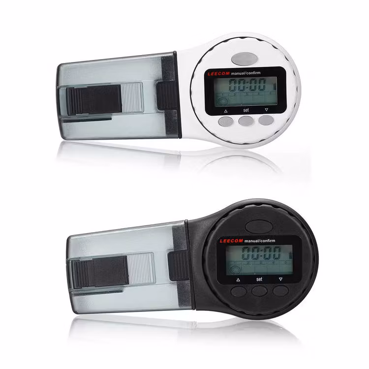 Leecom foderautomat kan ställas in att mata upp till 5 gånger per dygn. Du kan själv bestämma om behållaren ska snurra 1, 2 eller 3 varv varje gång den matar. Fungerar med flingor, granulat, chips och pellets.