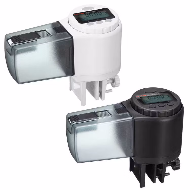 En fiskfoderautomat är ett bra verktyg om du ska resa bort eller för den som gillar rutiner. På ett givet klockslag snurrar foderbehållaren runt och beroende på hur stor öppning du har ställt in ramlar en viss mängd foder ut i akvariet.